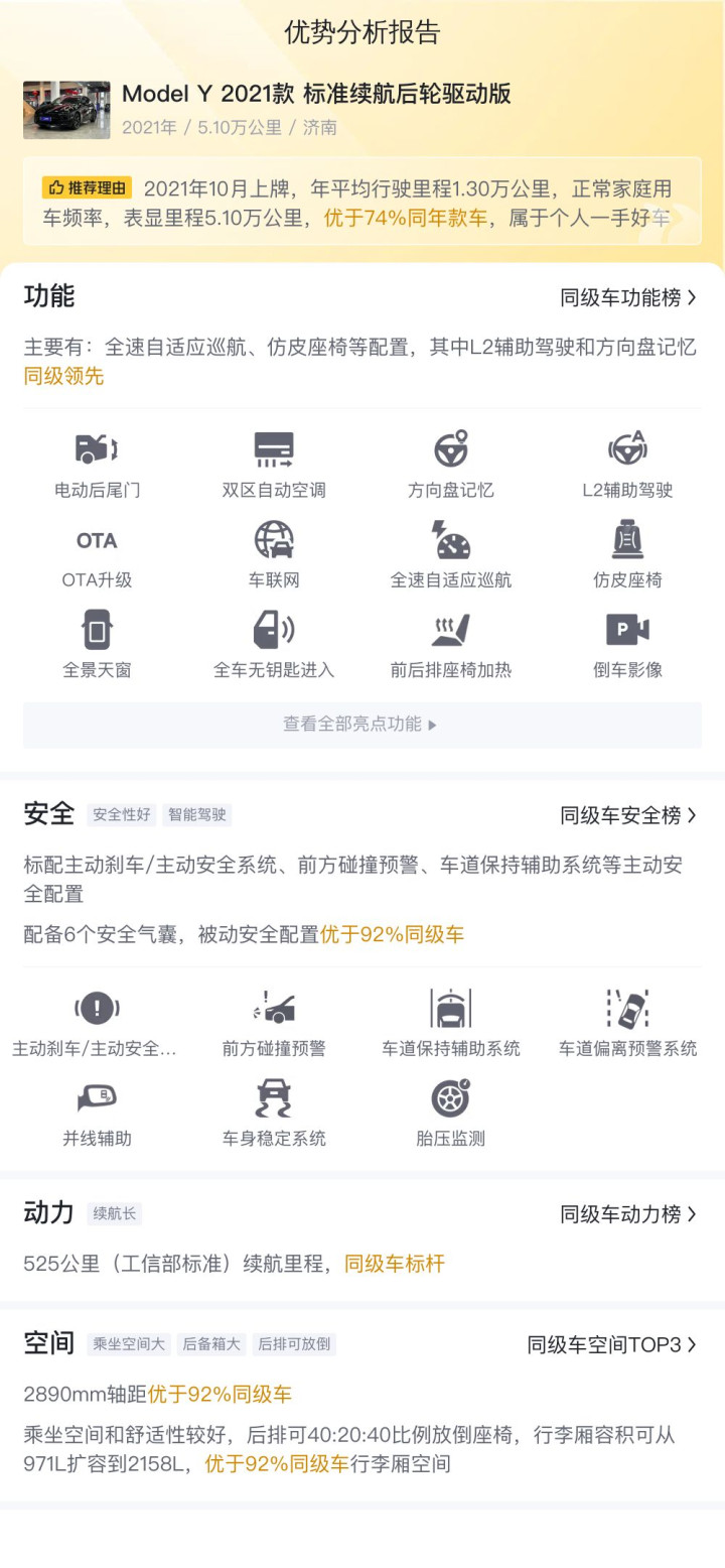 综上所述,这辆二手Model Y 2021款 标准续航后轮驱动版是一款性能出色、品质可靠的新能源车型,适合追求时尚、科技、环保的消费者购买。但买家也应该注意车辆的车况、维修保养费用和续航里程等因素,做出明智的购买决策。