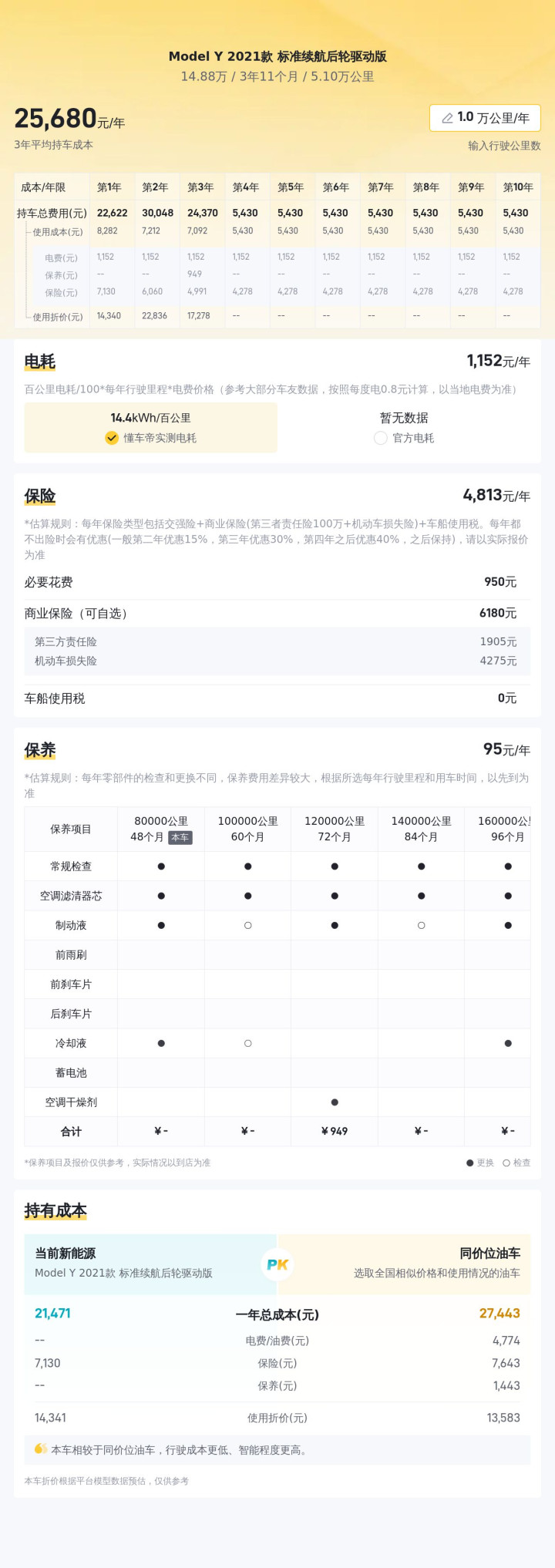 根据懂车帝的大数据计算,这辆二手Model Y 2021款 标准续航后轮驱动版的10年平均用车成本约为26403元/年,其中电费、保险费和保养费分别为2687元/年、5130元/年和3586元/年。这一成本在同类车型中处于适中的水平,但对于普通消费者来说,仍然需要一定的经济实力才能承担。因此,在购买之前,建议消费者充分考虑自身的经济状况和用车需求,做好预算规划,避免出现不必要的经济压力。